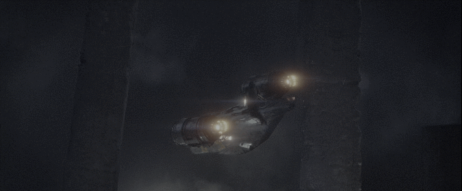 만달로리안은 만달로리안들의 호위를 받으며 비행을 시작한다.