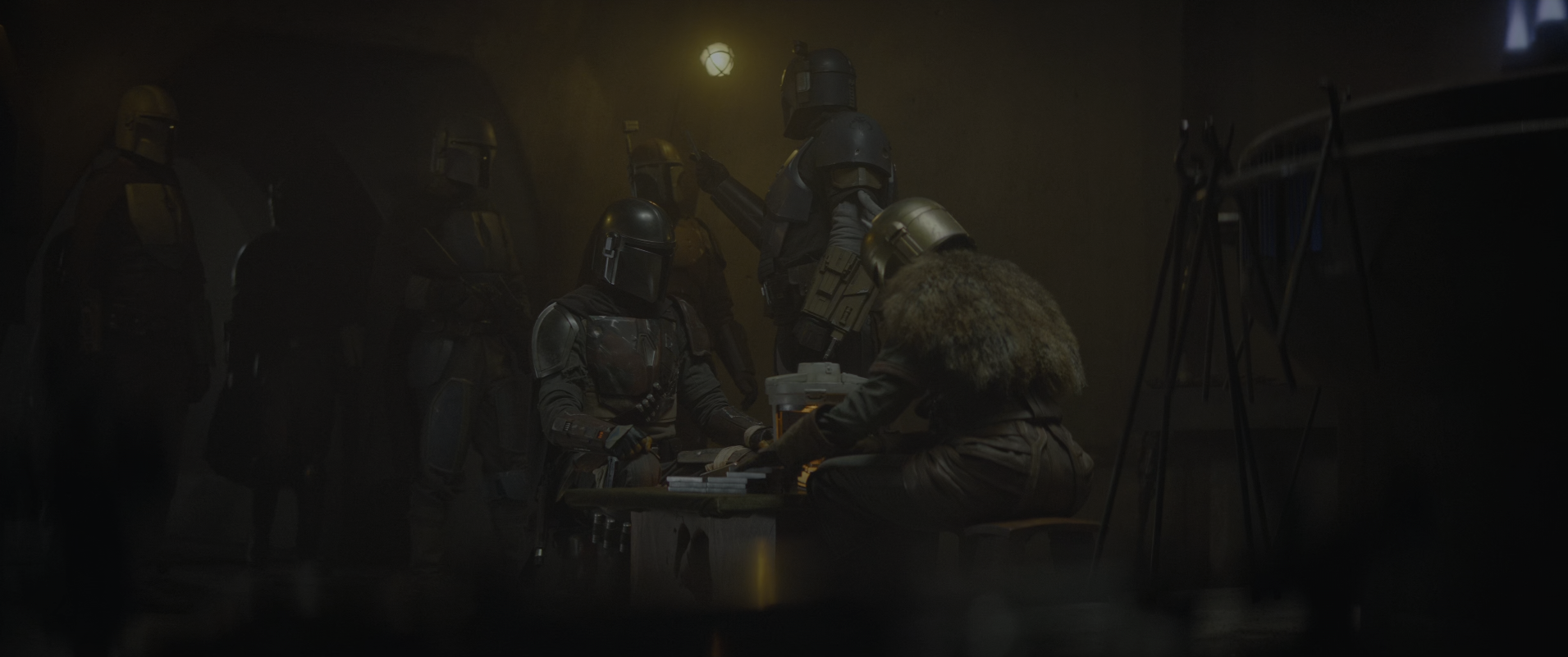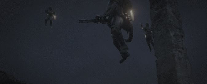만달로리안은 많은 바운티 헌터들에 둘러쌓여 고군분투하지만 역부족인 상태의 마지막 순간에, 만달로리안들이 비밀 아지트에서 나와 합류한다.