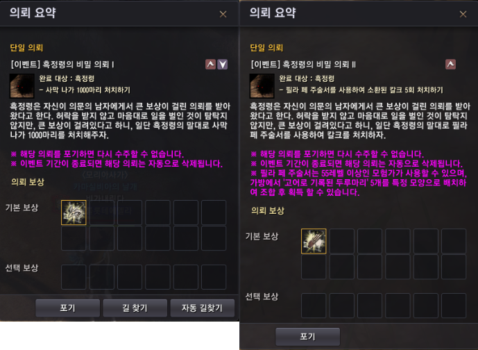 - 두 개 중 하나의 의뢰를 수락하여 진행 중일 때 다른 의뢰는 수주할 수 없습니다.