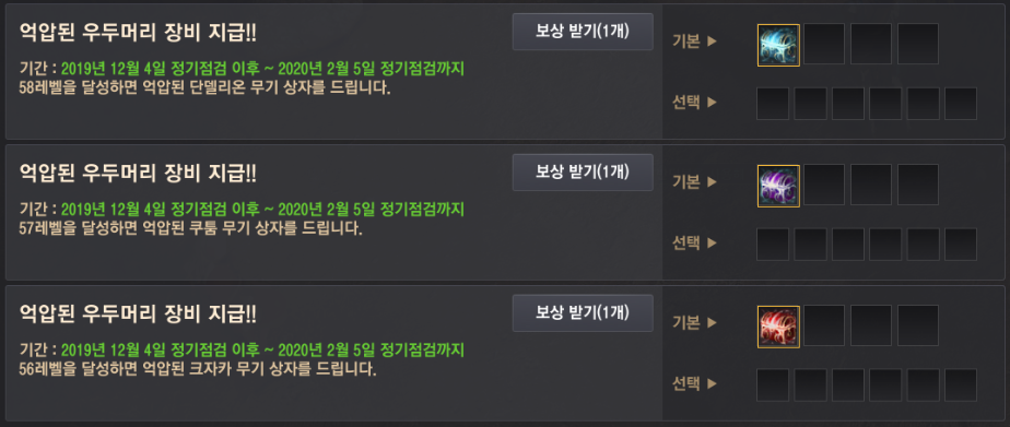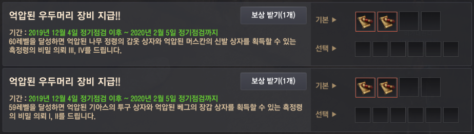 지난 5월 30일 펄어비스 서버 이관 이벤트로 지급하였던 억압 장비가 5주년 기념으로 다시 지급 받을 수 있게 되었어요. 다만 리세마라 논란을 의식해서 인지 억압된 크자카 무기, 억압된 쿠툼 무기, 억압된 단델리온 무기는 바로 수령 가능하지만, 억압된 기아스의 투구, 억압된 기아스의 투구, 억압된 기아스의 투구, 억압된 나무 정령의 갑옷의 억압 방어구 4종은 의뢰를 수행하는 방식으로 변경되었어요.