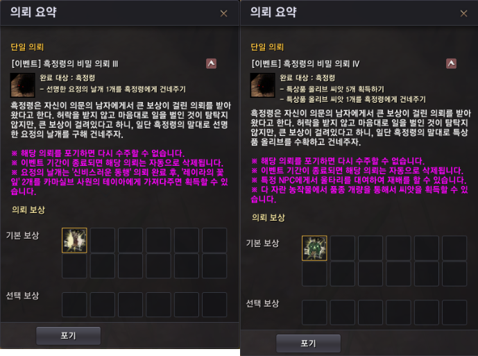 ※ 이전까지 해당 의뢰를 정상적으로 진행하신 모험가 여러분께는 의뢰 재료 아이템을 추가로 지급해드렸습니다.