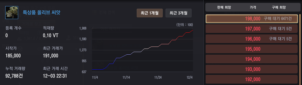 특상품 올리브 씨앗이 품귀라고... 하더라구요. 어느 정도 유저들이 억압 의뢰를 완료하면 매물이 다시 생기겠지만, 기다리기 힘든 유저라면 칼페온 <씨앗상인> 아르에게서 올리브 씨앗(2칸 작물/개당 4,560 은화)를 구매서 직접 텃밭에 심고 개량해서 고급 올리브 씨앗을 얻고, 다시 심고 개량해 특상품 올리브 씨앗을 얻을 수도 있어요.