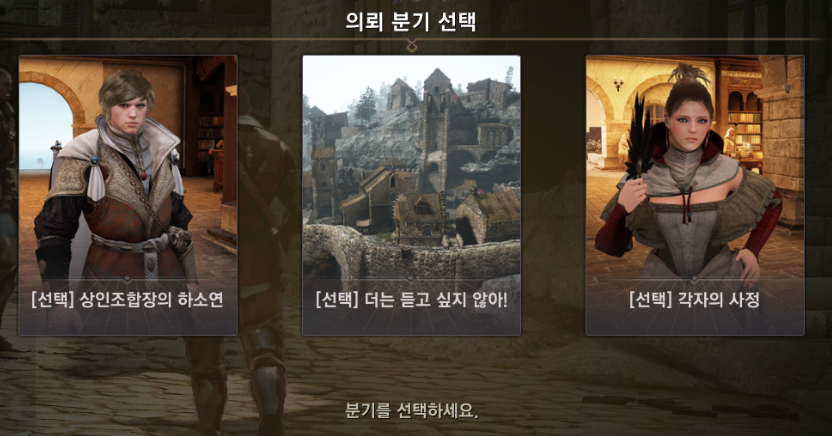 | [선택] 상인조합장의 하소연 | [선택] 더는 듣고 싶지 않아! | [선택] 각자의 사정 |