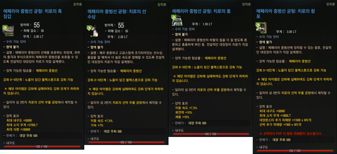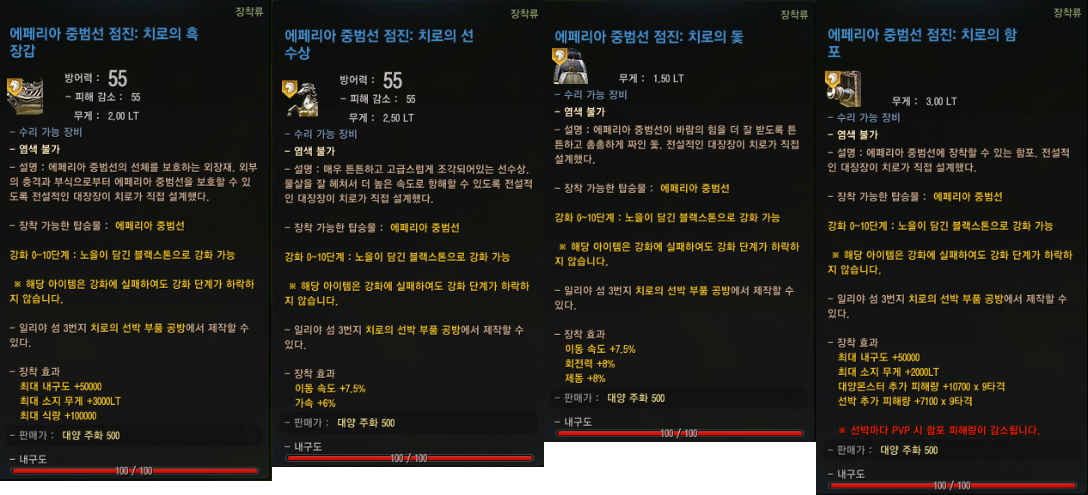 2019년 12월 31일 업데이트로 에페리아 중범선 점진/균형/비상/용맹의 파란색 등급 장비가 추가 되었어요.