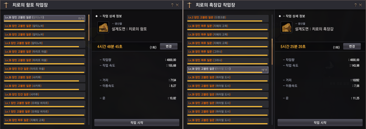 작업량이 4000으로, 에페리아 마을부터 알티노바까지 대부분의 도시 장인 고블린으로 4시간 50분 ~ 5시간 30분 사이의 시간이 소모되는 걸로 보여요.