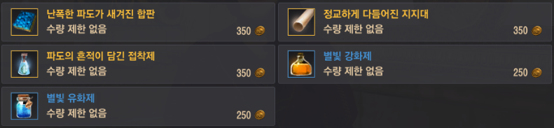 | 파도의 흔적이 담긴 접착제 1개 (간이연금) | 난폭한 해양 괴수의 진액 1개, 별빛 유화제 1개 |