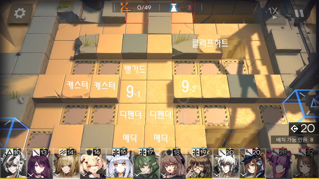 e. 처치 수 40초반에 오른쪽 라인에서 마지막 아츠 가드 리더가 지나가면 클리프하트를 소환 해제하고, 여분의 디펜더, 메딕, 딜러를 9-2번 자리나 주위에 놓아주세요.
