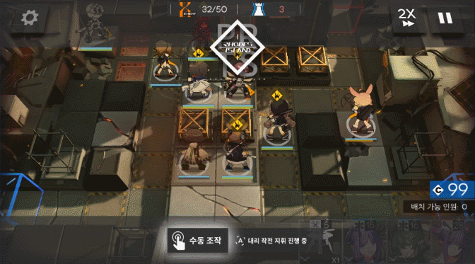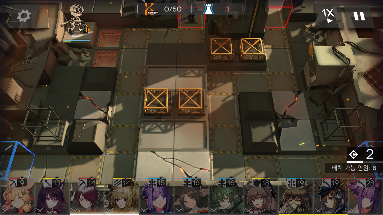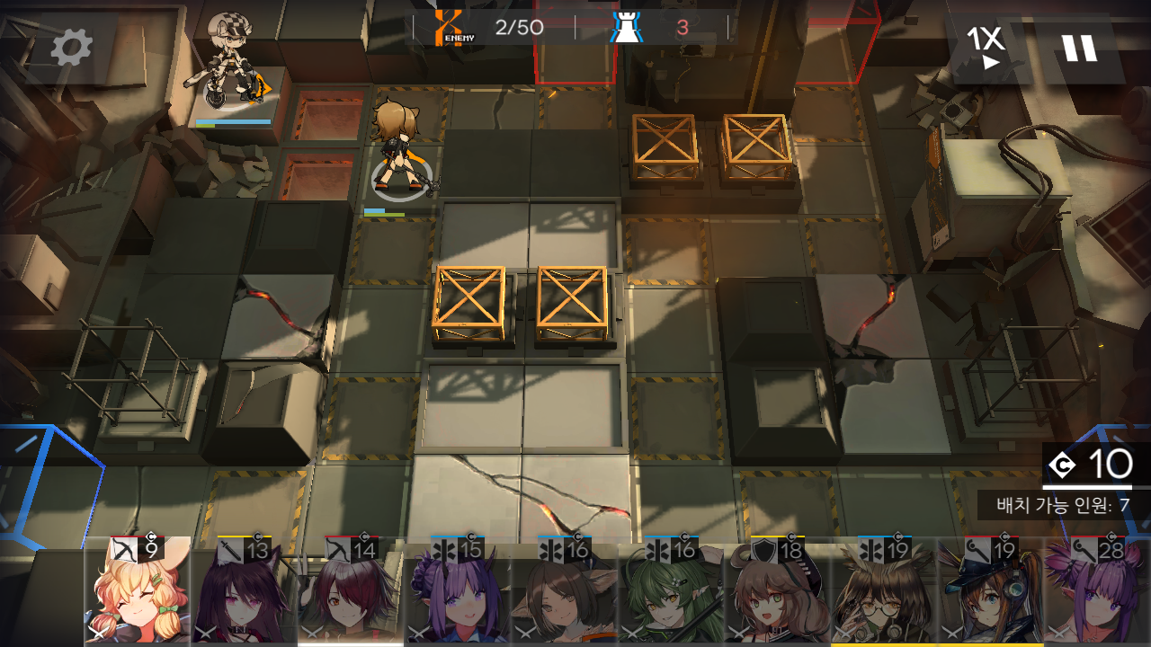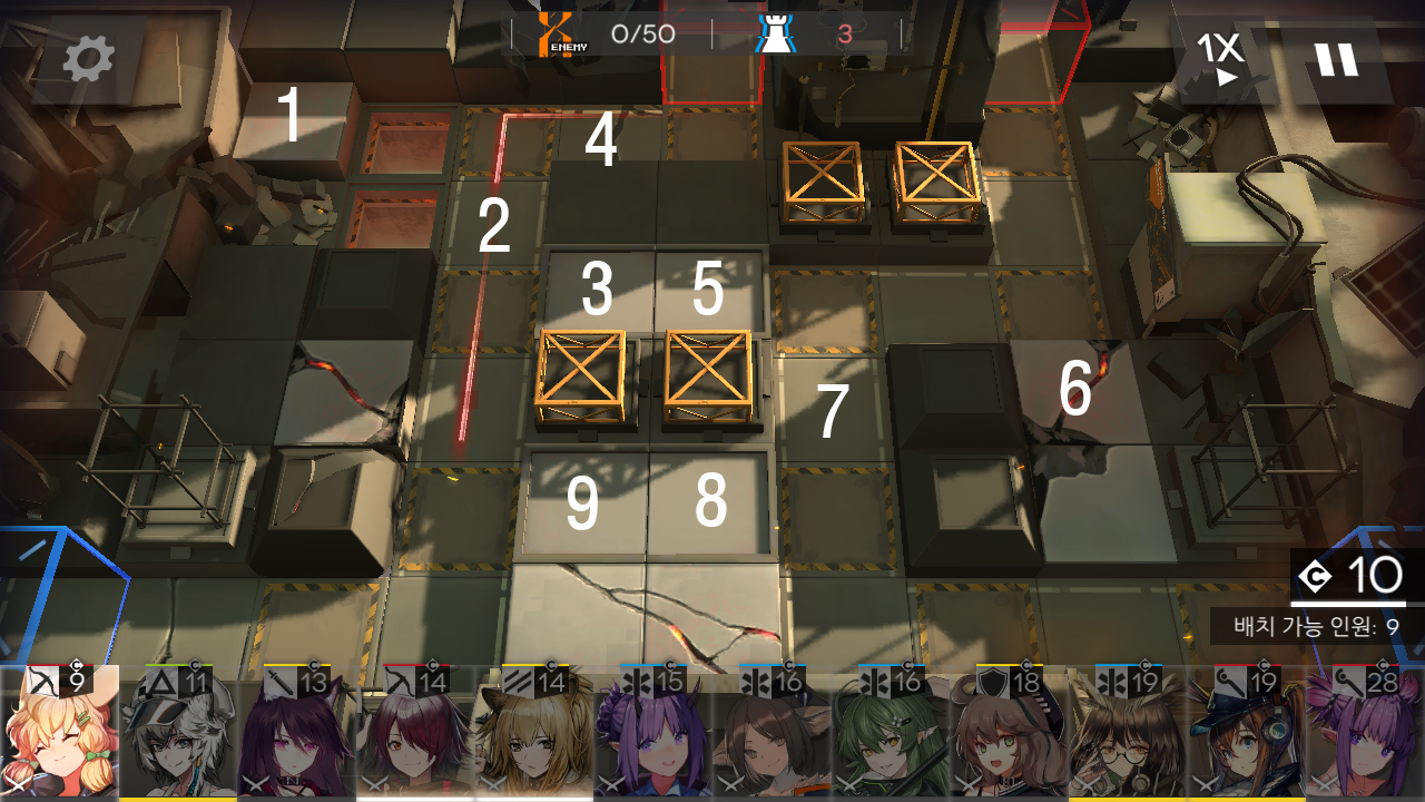 c. 5번, 6번 자리에 오른쪽을 담당할 스나이퍼를, 7번 자리에 디펜더, 8번 자리에 공중 유닛과 오른쪽을 보조할 원거리 딜러를 놓는데요. 블루포이즌 정도의 원거리 딜러가 있다면, 6번 자리 후방에 원거리를 딜러를 하나 더 놓고 디펜더를 제외해도 대부분 5번 자리를 통과하기 전에 처리되기 때문에 문제는 없더라고요.