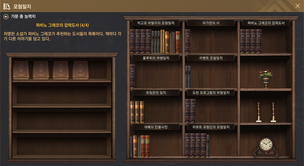 2020년 2월 12일 업데이트 추가된 모험일지 파비노 그레코의 잡학도서 4권이에요. 모험일지가 요구하는 조건을 완료하면 계정 내 모든 캐릭터에 적용받는 최대 생명력 증가 수치를 얻을 수 있어요.