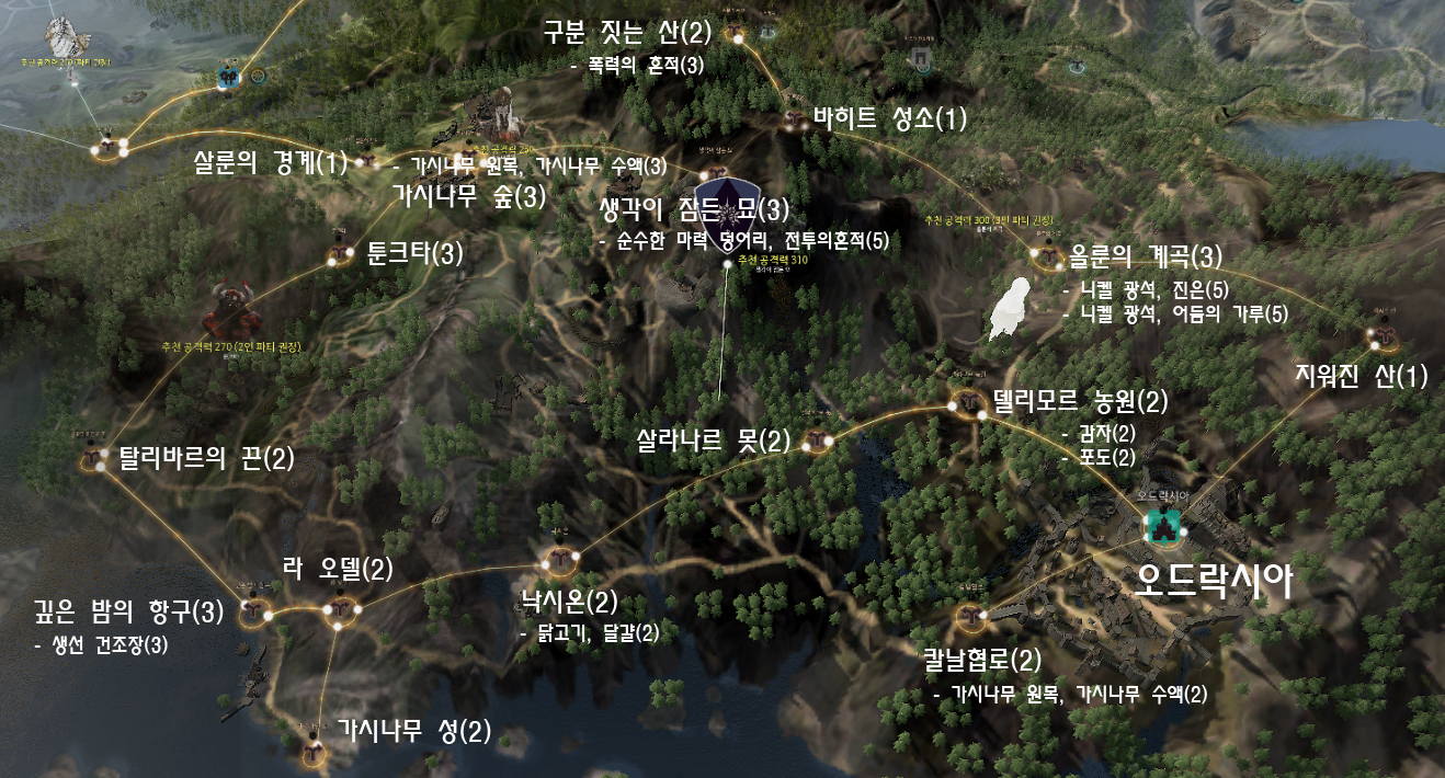 기존 노드에서의 연결 점은 카마실비아 지역의 그늘나무 숲과 오딜리타 지역의 살룬의 경계만 연결되고, 수도 오드락시아는 창고가 있는 기본적인 메인 도시예요.