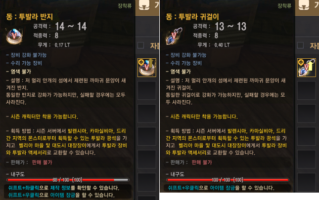 - 주무기, 보조무기, 각성무기, 투구, 갑옷, 장갑, 신발은 투발라 광석 1개로 교환할 수 있고, 반지, 목걸이, 귀걸이, 허리띠 등 장신구류는 투발라 광석 5개로 교환할 수 있어요.