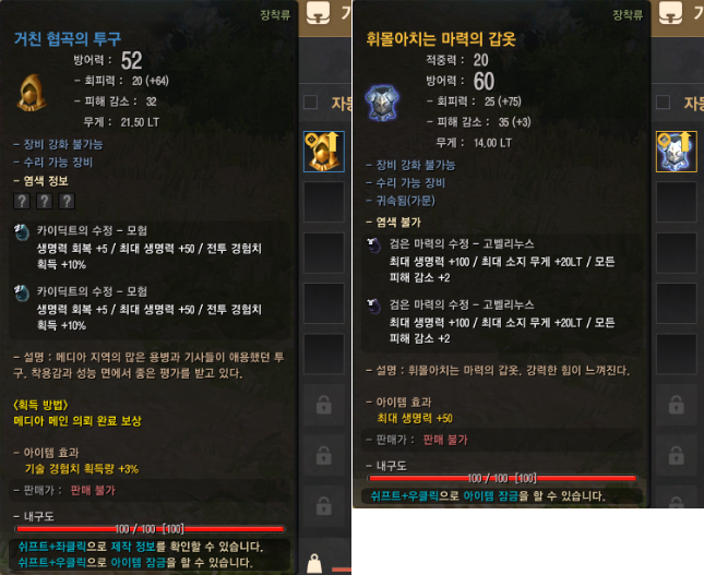 | 동(V) 투발라 갑옷 + 졸업장 | 유(IV) 우둔한 나무 정령의 갑옷 |