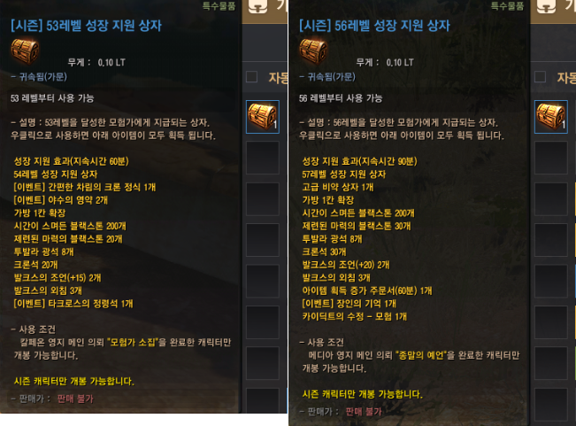 - 메인 의뢰를 진행해야 하는 이유가 되기도 하는데, 30 레벨, 50 레벨, 53 레벨, 56 레벨 상자는 레벨 요구 조건 외에 각 지역 메인 의뢰 완료 조건이 있기 때문에 모든 상자를 오픈하기 위해서는 메디아 지역까지는 메인 의뢰를 진행해야 해요.