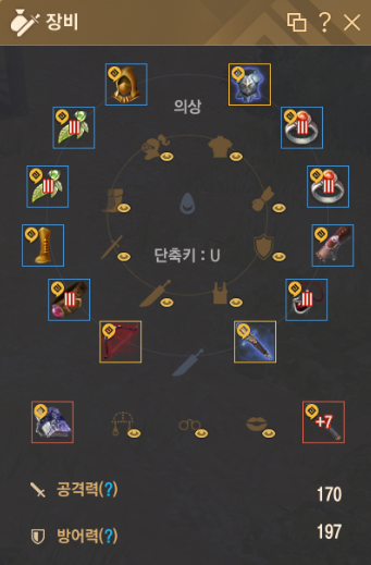 - 착용 부위는 주무기, 보조무기, 각성무기, 투구, 갑옷, 장갑, 신발