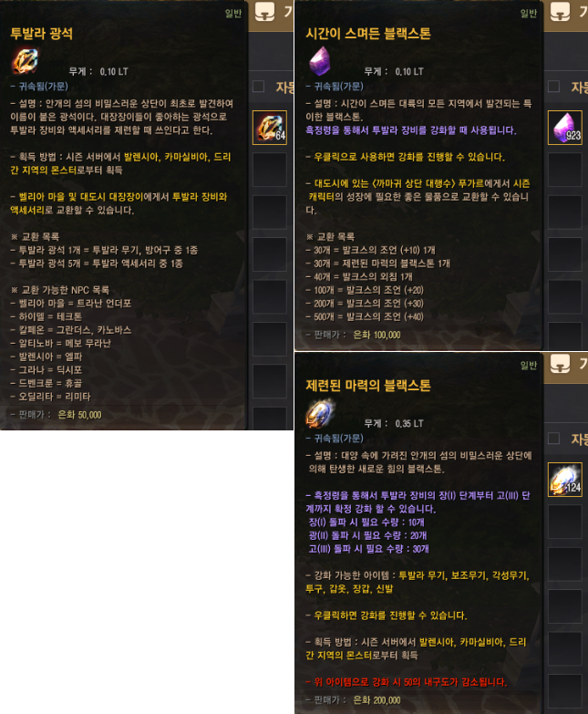 - 일반 서버와 시즌 서버를 구분 짓는 건 시즌 아이템들이에요. 투발라 광석과 시간이 스며든 블랙스톤, 제련된 마력의 블랙스톤 그리고 투발라 장비 아이템인데요.