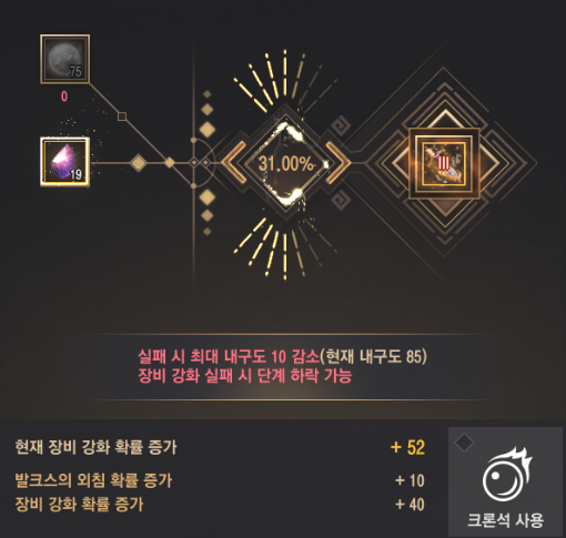 - 유 강화시, <까마귀 상단 대행수> 푸가르의 의뢰 보상인 발크스의 조언(+40)과 발크스의 외침을 넣는다면 52 스택에서 31% 확률