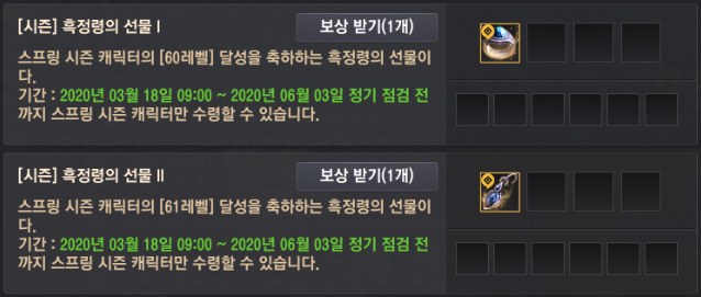 | [검은사막] 스프링 시즌 - 레벨별 성장 지원 상자, 스프링 과제 보상, 흑정령 패스 보상 (2) | 2020.03.18 |