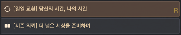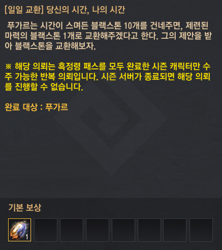- 흑정령 패스를 모두 완료하면, 추가로 [일일 교환] 당신의 시간, 나의 시간 의뢰를 수행할 수 있으며, 완료 시 [시즌] 목표 달성 보상 상자와 [이벤트] 엘리언의 눈물을 매일 획득할 수 있어요.