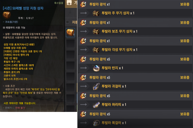 - 50 레벨부터 56 레벨 상자까지는 투발라 아이템 강화 재료도 획득할 수 있어요.