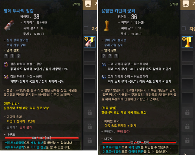 - 그중 메인 의뢰 보상 아이템들을 일반 서버에서 가져와 착용할 수 있는데요. 대표적인 장비 아이템은 칠흑 장막의 주무기, 모래바람 보조무기, 거친 협곡 투구, 휘몰아치는 마력의 갑옷, 명예 투사 장갑, 용맹한 카탄의 군화예요.