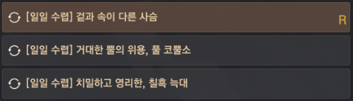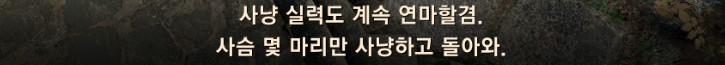 | 1 | [일일 수렵] 겉과 속이 다른 사슴 | 죽은달 초소 | 로사우 | 수렵 경험치, 수렵꾼의 증표7 |