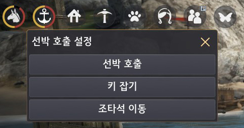 - 화면 좌측 상단의 선박 아이콘 클릭 시 키 잡기, 조타석 이동, 선박 호출 버튼이 출력됩니다.