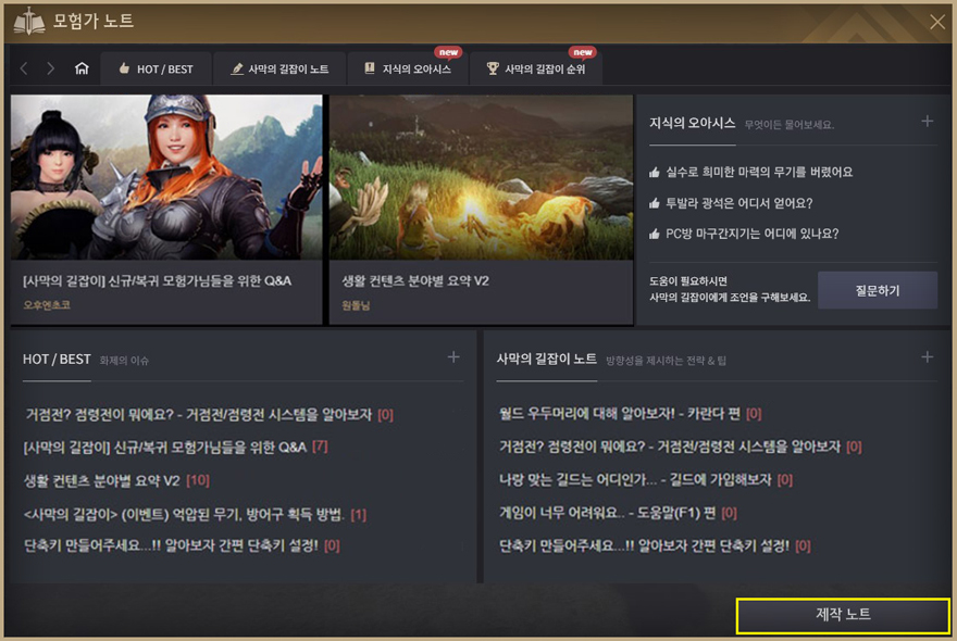 2. 모험가 노트 하단에 제작 노트 버튼이 추가되었습니다.