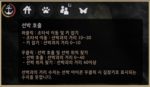 선박과의 거리에 따라 - 좌클릭 (조타석 이동 및 키잡기) - 우클릭 (선박 호출 및 선박 위치 찾기) |