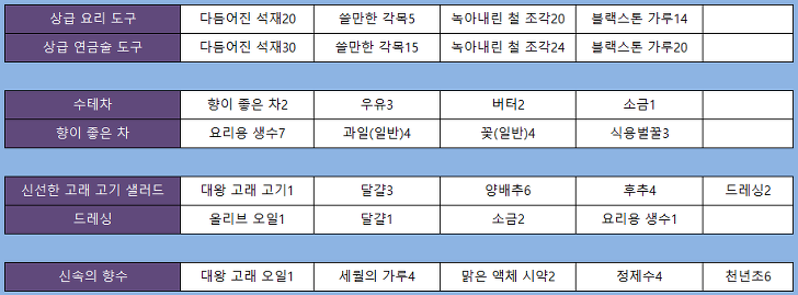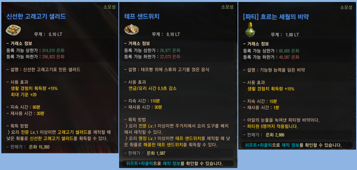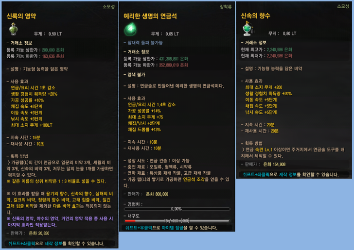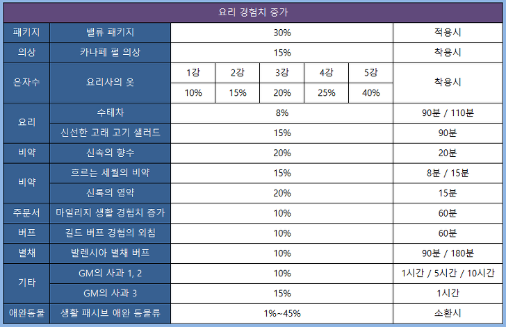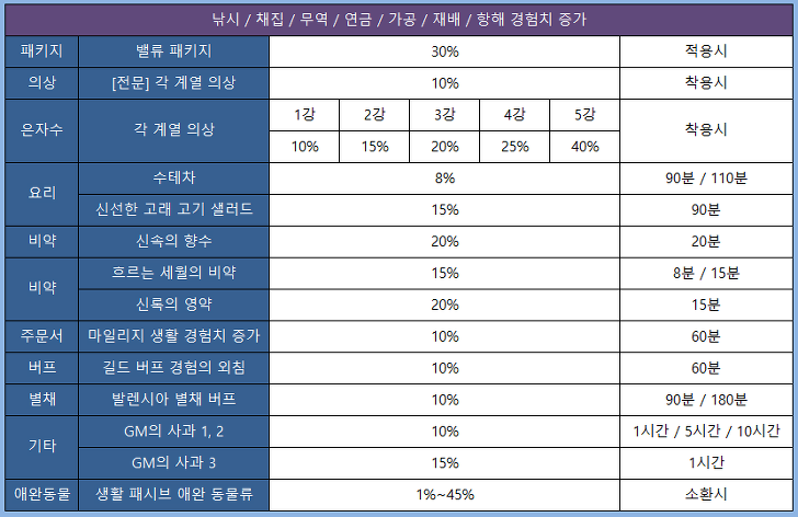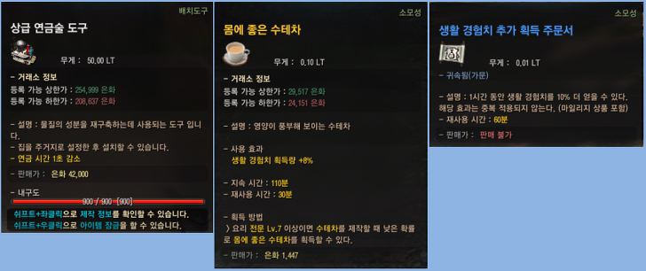 요리 제작 시간 감소, 연금 제작 시간 감소 그리고 요리 경험치 증가, 연금 경험치 증가 - 생활 경험치 증가
