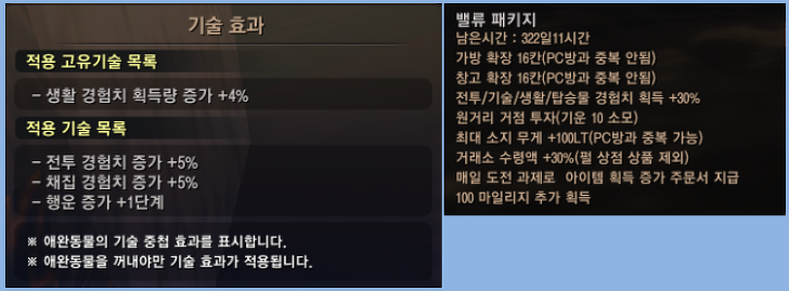 그리고 마지막으로 애완동물인데, 검은사막 인벤 팁 게시판에서 다른 분의 자세한 글도 찾을 수 있겠지만, 몇 번의 변동이 있어서, 현재 기준으로는 생활 경험치 증가 패시브를 가지고 있는 고슴도치, 고양이, 어린 양, 펭귄, 차피챱 4세대에 원하는 생활 계열 5% 붙인 마리당 경험치 증가 9% x 5마리 = 45% 가 맥시멈으로 보면 될듯해요.