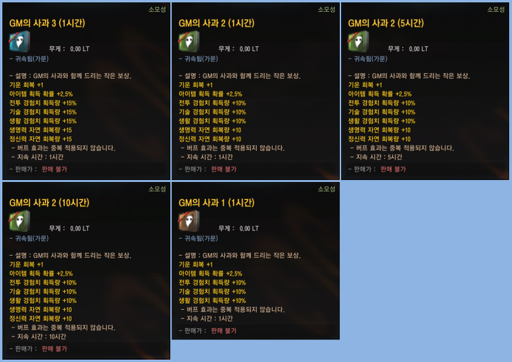 예기치 않은 임시점검과 같은 상황에 간혹 받을 수 있는 GM의 사과에 역시 10% 가 붙어있어요. 15% 인 GM의 사과3 은 죽을 죄를 지었을 때나 나왔던 걸로 기억하기에 보유한 게 몇 장 안되더라고요.