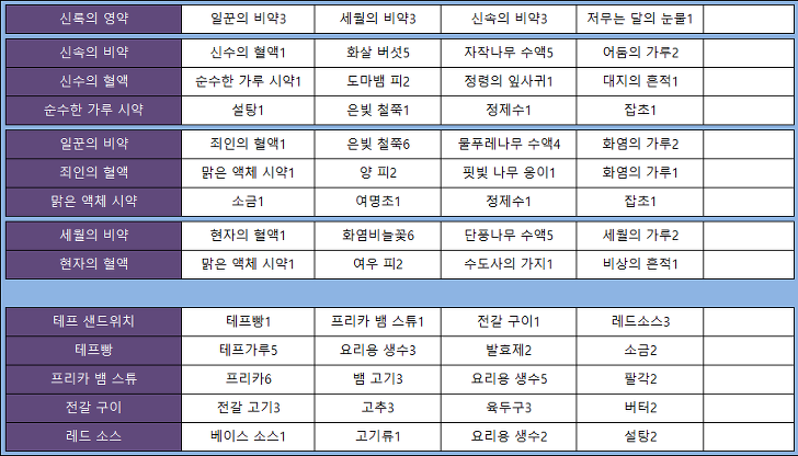도핑 가능한 요리와 비약들의 레시피이고요.