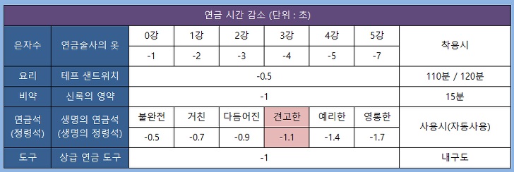 예를 들어 은자수 요리사 옷 4강을 가지고 있다면 은자수에서 -5초, 카나페에서 -2초, 테프 샌드위치 -0.5초, 예리한 생명의 연금석 1.4초 하면 중급 요리도구를 사용하고 신록의 영약을 사용하지 않아도 요리 시간 1.1초가 나오는 방식이에요.