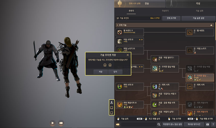 - 기술 프리셋은 현재 배운 기술과 기술 특화를 모두 저장하고 불러올 수 있는 기능입니다.