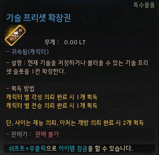 - 기술 프리셋 확장권은 캐릭터 각성과 전승 의뢰 완료 시 한 개씩 획득할 수 있습니다.
