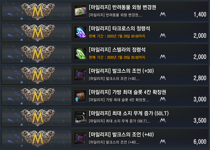 | [이벤트] 스텔라의 정령석 | 2,000 | 가문당 1회 구매 가능(7월29일 점검전까지 판매) |