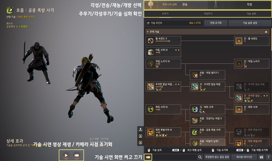 - 기술 창 하단의 버튼을 통해 기술 시연 화면을 켜거나 끌 수 있습니다.