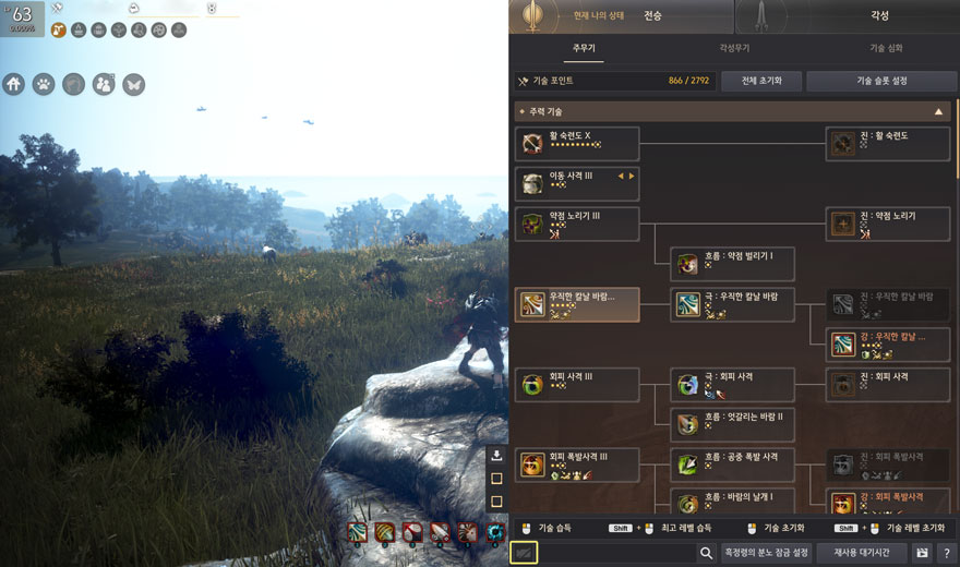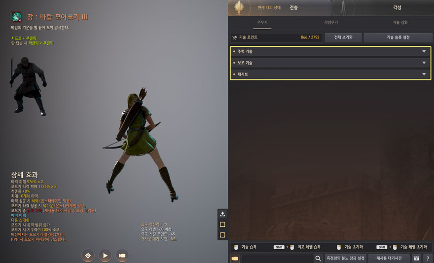 - 새로운 기술 창의 주무기 기술은 주력 기술, 보조 기술 및 패시브 기술로 분류되어 있습니다.