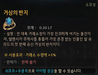 - 이제 거상의 반지는 거래소 입찰 확률 증가가 아닌, 거래소 수령액 증가(수수료 감면) 효과로 적용됩니다.