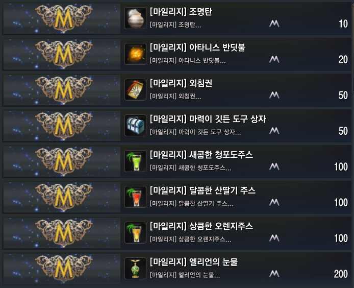 | 아이템 | 마일리지 가격 | 제한 사항 |