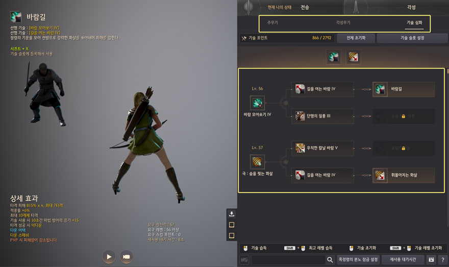 - 전승/각성 여부와 무관하게 주무기와 각성무기, 기술 심화 카테고리를 분리해서 확인할 수 있습니다.