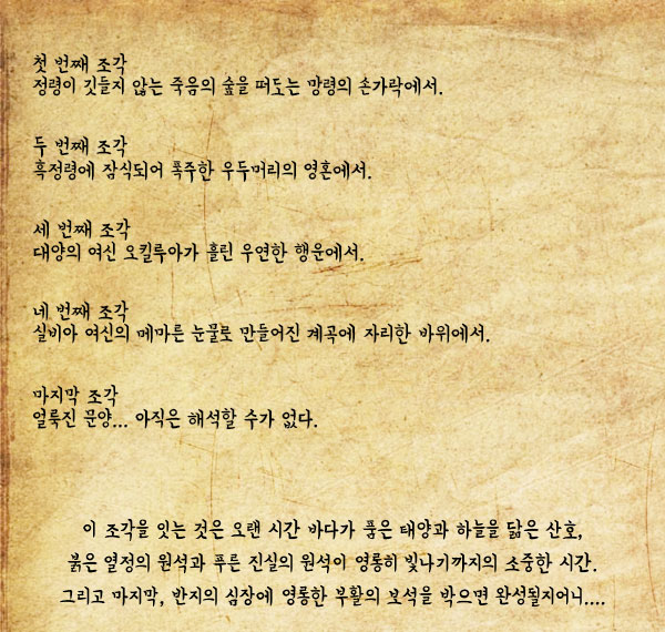 2. 거상의 반지 조각을 보았다는 이야기가 대륙 곳곳에서 들려오기 시작했습니다. 한 모험가가 거상의 반지를 손에 얻기 위해 근거 있는 이야기들을 취합해 보니 아래와 같은 실마리가 나왔습니다.