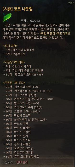 8. 검은사막 시즌 도전과제를 통해 ‘코코 나뭇잎’이 발급되기 시작하였습니다.