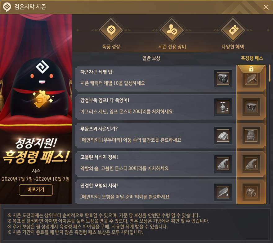 - 펄 상점(F3)에서 '흑정령 패스' 아이템을 구매해 사용하면 더욱 특별한 보상 아이템을 추가로 받을 수 있습니다.