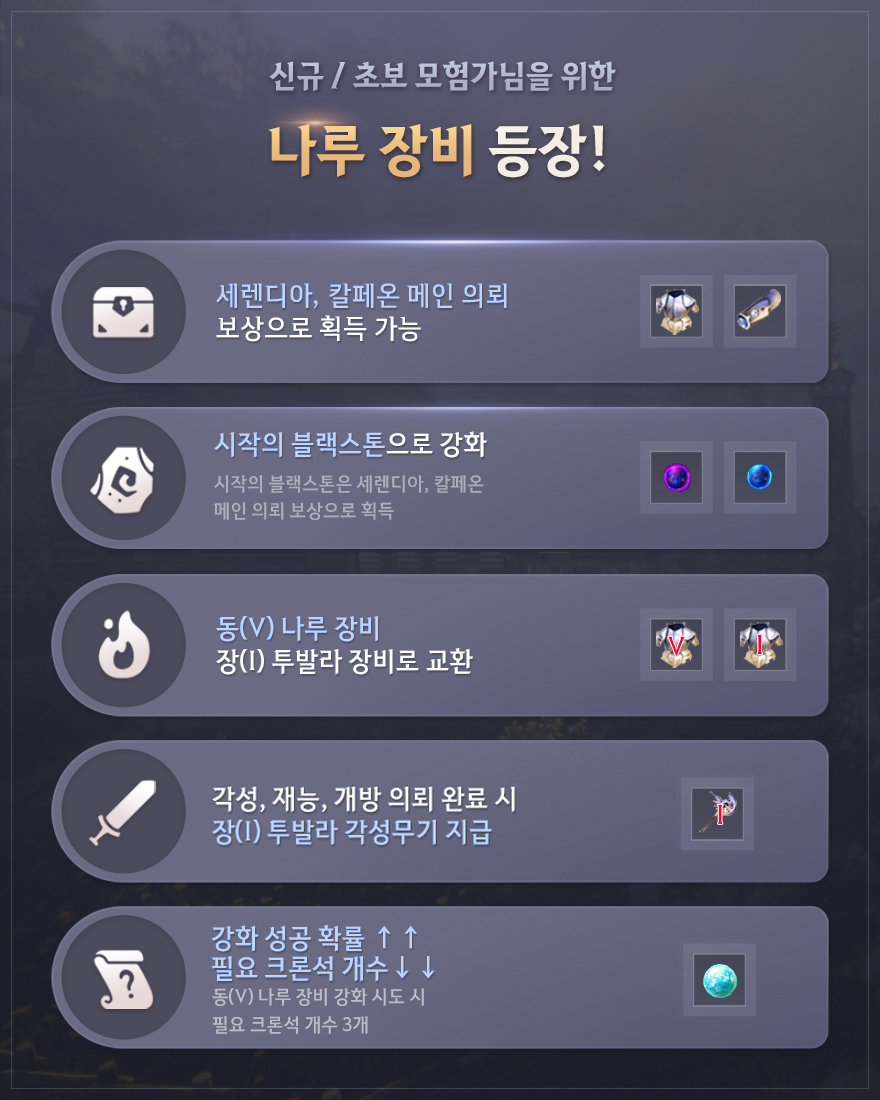 - 나루 장비는 신규 / 초보 모험가님들을 위해 만들어진 장비입니다. 신규 / 초보 모험가 여러분이 조금 더 쉽게 강화 시스템을 습득할 수 있도록 만들어졌기에, 투발라 장비에 비해 강화 성공 확률이 높으며 필요한 크론석의 개수도 동(V) 강화 시도 시 3개로 굉장히 적습니다. 메디아 지역까지 모험하며 획득한 나루 장비와 시작의 블랙스톤을 통해 동(V) 나루 장비를 획득해 주세요.