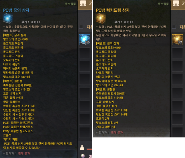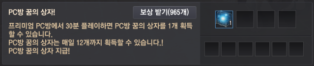 개인적으로는 PC방 럭키드림 상자로 여는 걸 선호한터라 PC방 꿈의 상자 965개를 가공해 PC방 럭키드림 상자 321개를 얻고, 오픈해 보았어요.
