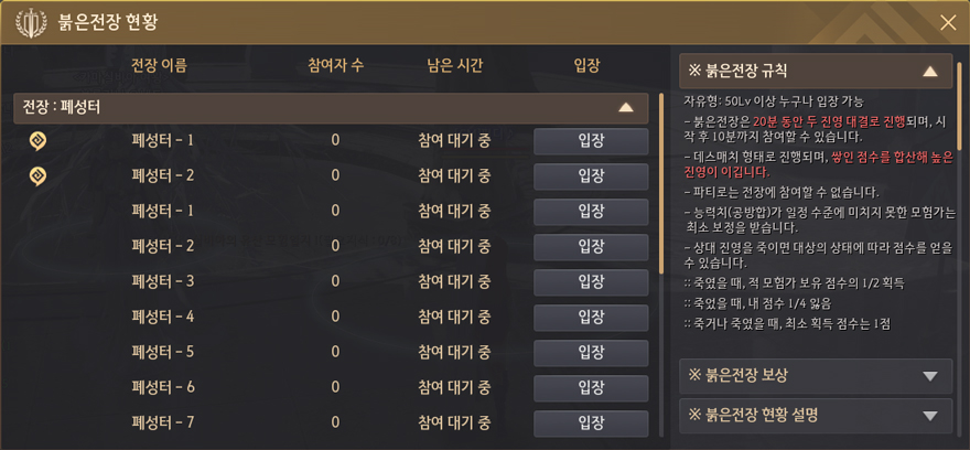 - 시즌 캐릭터 전용 폐성터 붉은 전장은 공격력 200, 방어력 250 이하 및 50 레벨 이상의 시즌 캐릭터로만 입장할 수 있습니다.