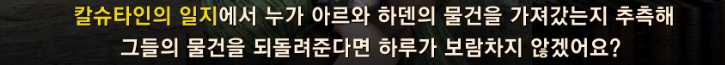 내용 - 칼슈타인의 일지에서 아르의 꽃을 가져간 범인 추측하기, 아르에게 무지개꽃 돌려주기, 칼슈타인의 일지에서 하덴의 거울을 가져간 범인 추측하기, 하덴에게 꿈꾸는 거울조각 돌려주기