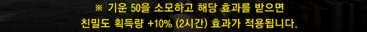 - 친밀도 획득량 +10% (2시간) 버프 / 기운 50 소모