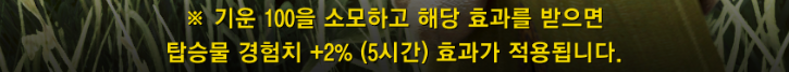 - 탑승물 경험치 +2% (5시간) 버프 / 기운 100 소모